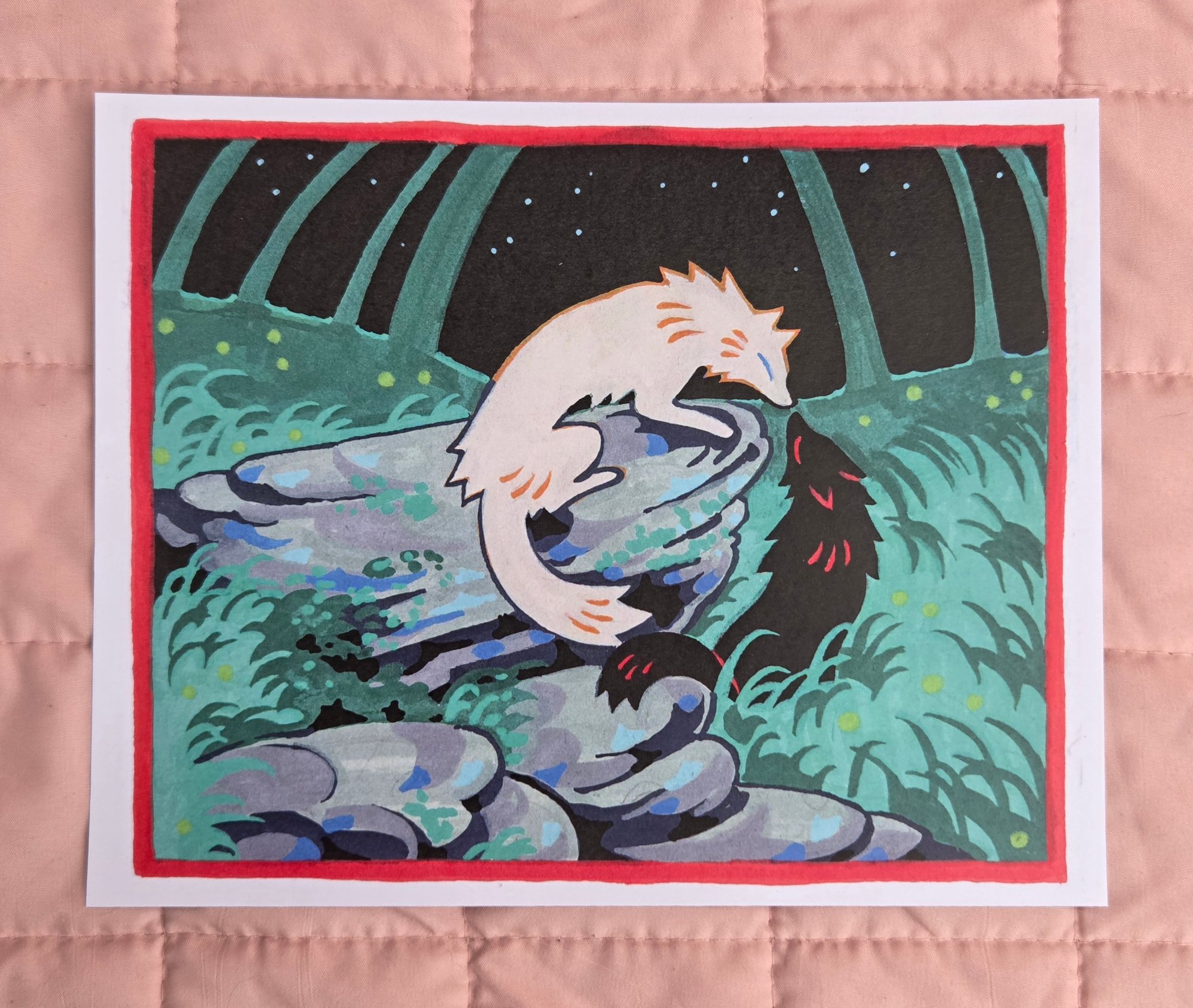 8 x 10 inch art print on heavy cardstock depicting two wolves touching noses in a field